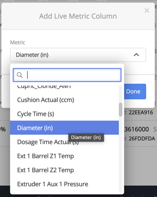 First, the Live Metric column allows you to add any data point and will show the current value of that data for each line. From the drop down, select that option and you will be presented with a pop over menu. Select the desired metric from the list and click Done to add a metric to the view.