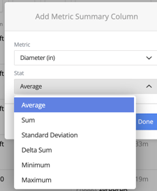 The last type of column that can be added is a Metric Summary. This similarly allows you to add any metric in your organization to the view, but instead of showing the most recent value, it will show a specified aggregate over the current time frame selected for the window. After selecting to add this column type you will see a pop-over menu. You can still select any metric configured in taxonomy, but also must specify an aggregation type.