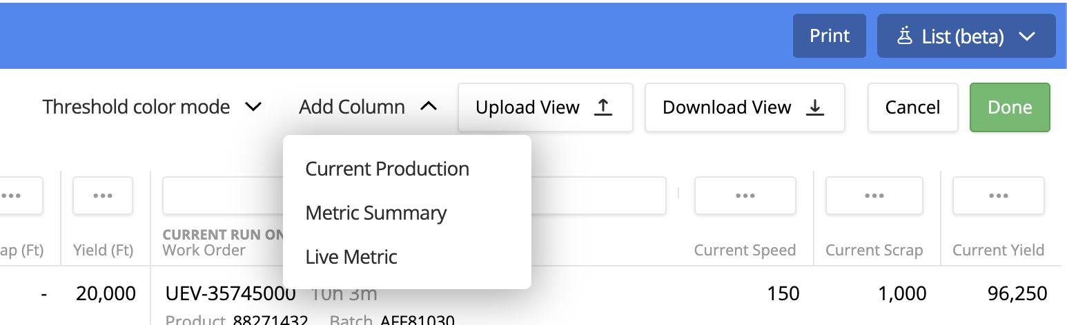 To add columns, start by clicking the Add Column drop down, which will present two or more options to select from. The Metric Summary and Live Metric options will always be available. You will also see any of the standard columns which have been removed from the page, such as Current Production as shown in the screenshot below.