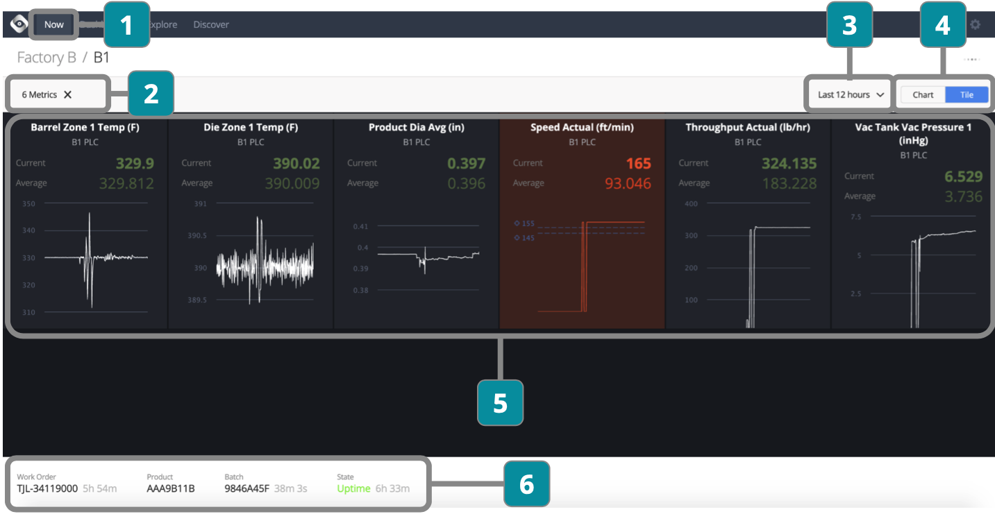 The Line Tile view shows the time-series behavior of selected metrics side-by-side, with color-coded indication of set-point deviations.