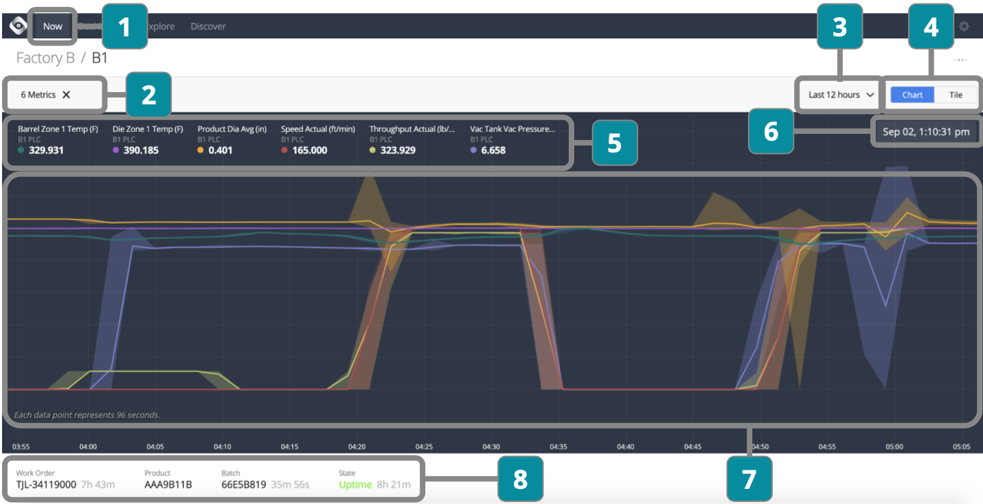 The Line Chart view shows the metrics on a line layered in a time-series view.