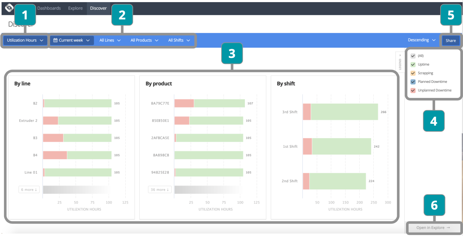 Discover provides interactive Pareto analysis to quickly identify opportunities for optimization across OEE components and drill down to specific needs across lines, products, and shifts